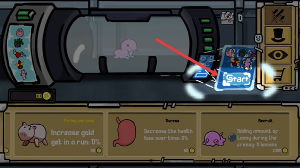 2、在飛船場(chǎng)景中,通過點(diǎn)擊Start按鈕,選定增益效果后,讓粉色角色Lanny開始逃亡挑戰(zhàn)。