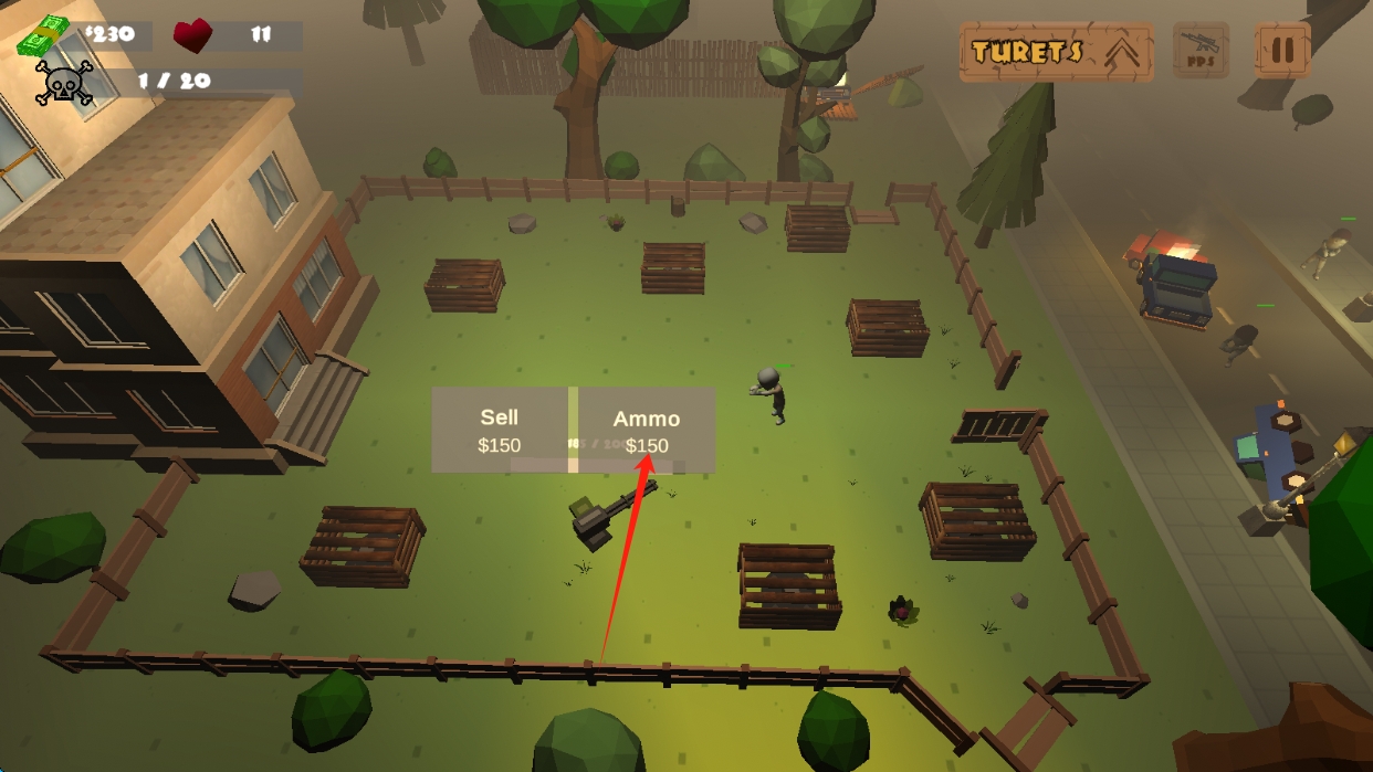 3、在塔防場景中,根據箭頭提示,點擊Ammo,花費150美元購買彈藥,提升防御能力,點擊升級。