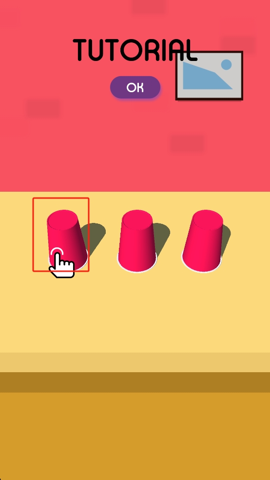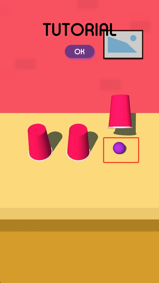 1、開局后我們先跟隨教程指引,點擊左側(cè)紅杯,掀開后留意紫色小球位置,完成藏球認(rèn)知步驟。