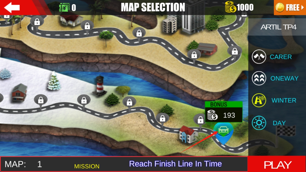 2、進(jìn)入地圖選擇場景,根據(jù)箭頭提示,選擇合適的地圖,確定比賽路線,為賽車挑戰(zhàn)做好準(zhǔn)備,點擊選擇關(guān)卡。