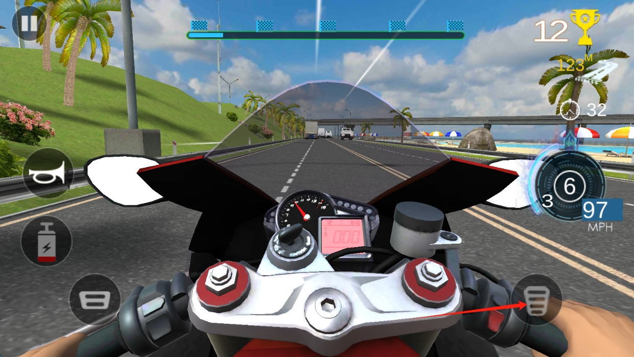 3、在駕駛操作場景中,根據(jù)箭頭提示,操控摩托車,躲避障礙,加速前進(jìn),順利完成賽車任務(wù),點擊加速。