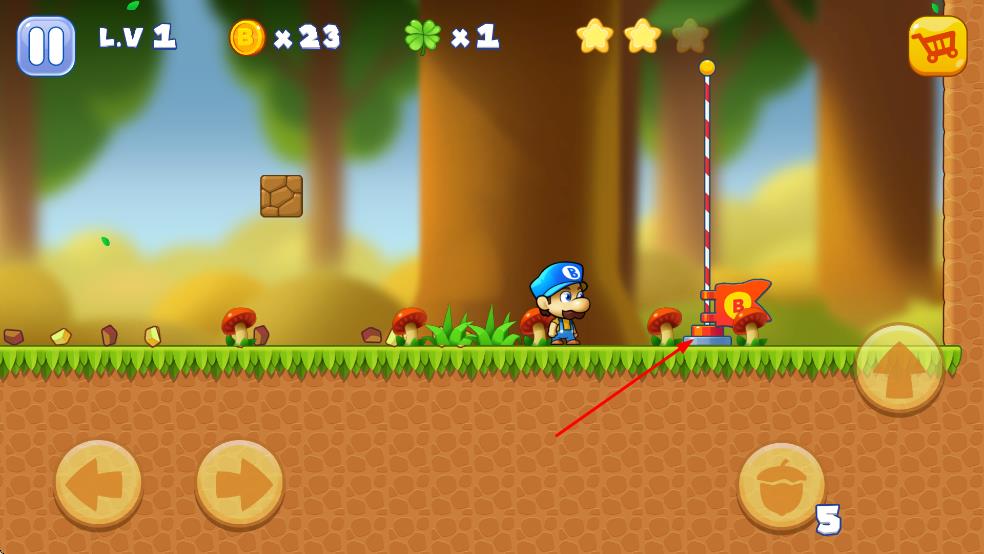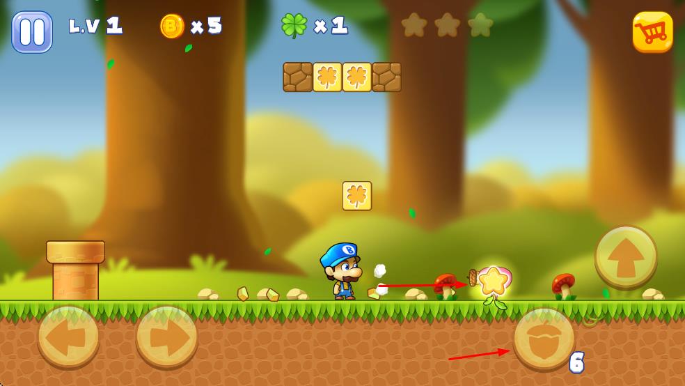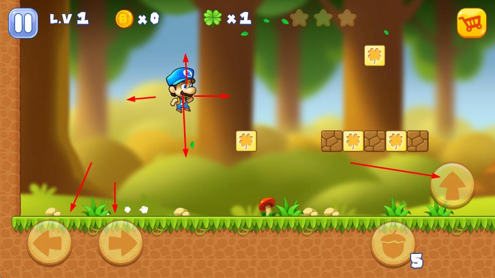 1、表明當(dāng)前關(guān)卡,操控藍(lán)色帽子角色在場(chǎng)景中移動(dòng),通過(guò)左下角方向鍵控制左右移動(dòng),右下角向上箭頭控制跳躍。