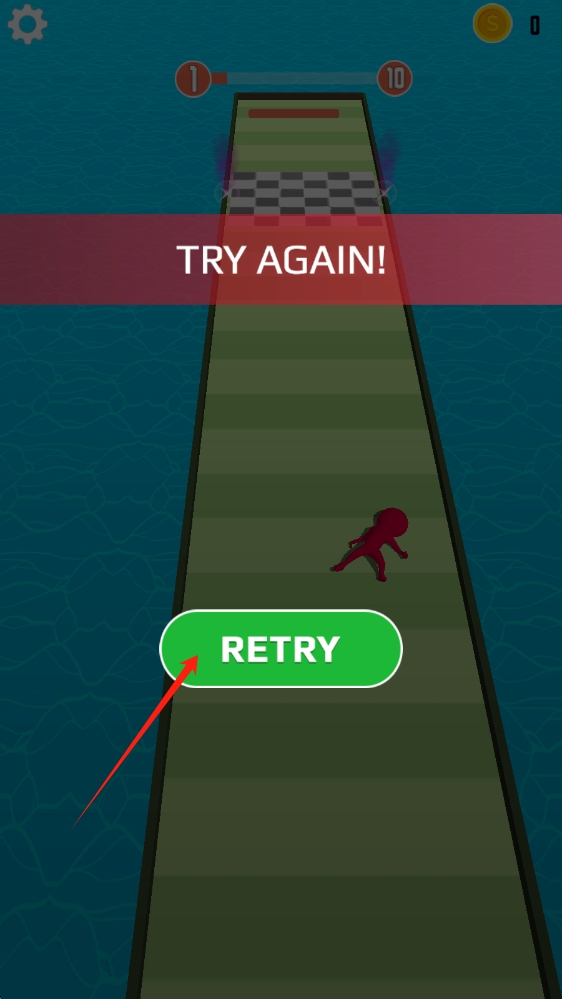 3、在游戲失敗界面,點擊RETRY,重新開始游戲,繼續(xù)跑酷挑戰(zhàn),提升跑酷技巧,點擊重開。