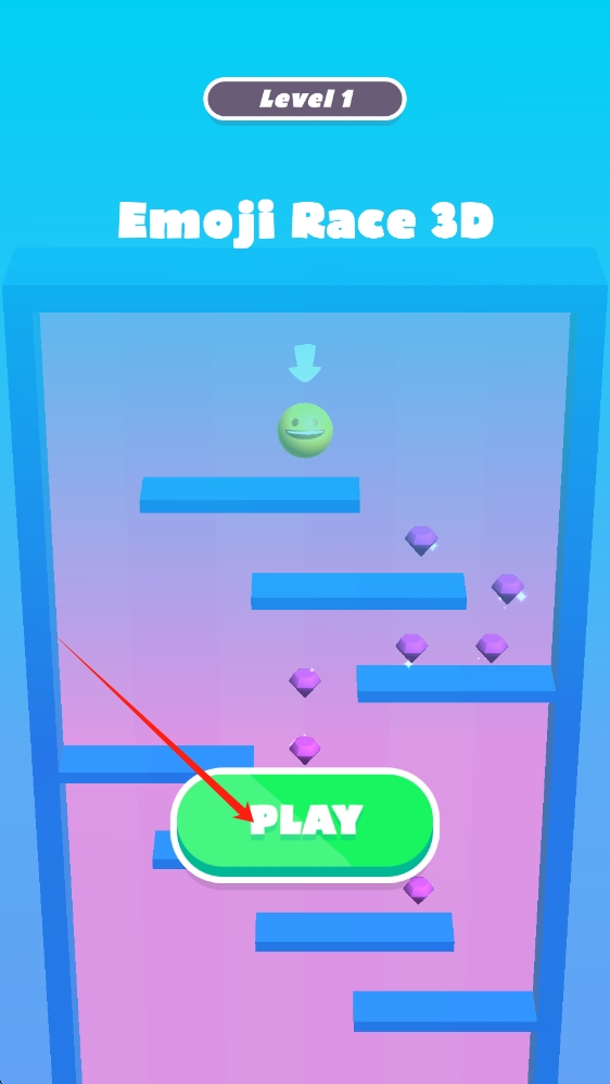1、在Emoji-Race-3D游戲第一關(guān)啟動(dòng)界面,跟隨箭頭提示,點(diǎn)擊PLAY,開(kāi)啟表情符號(hào)競(jìng)賽冒險(xiǎn),點(diǎn)擊開(kāi)始游戲。