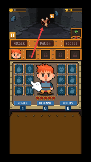 3、在地牢戰(zhàn)斗界面,按指引點(diǎn)擊上方武器,裝備或使用道具,提升角色戰(zhàn)斗能力應(yīng)對(duì)敵人。