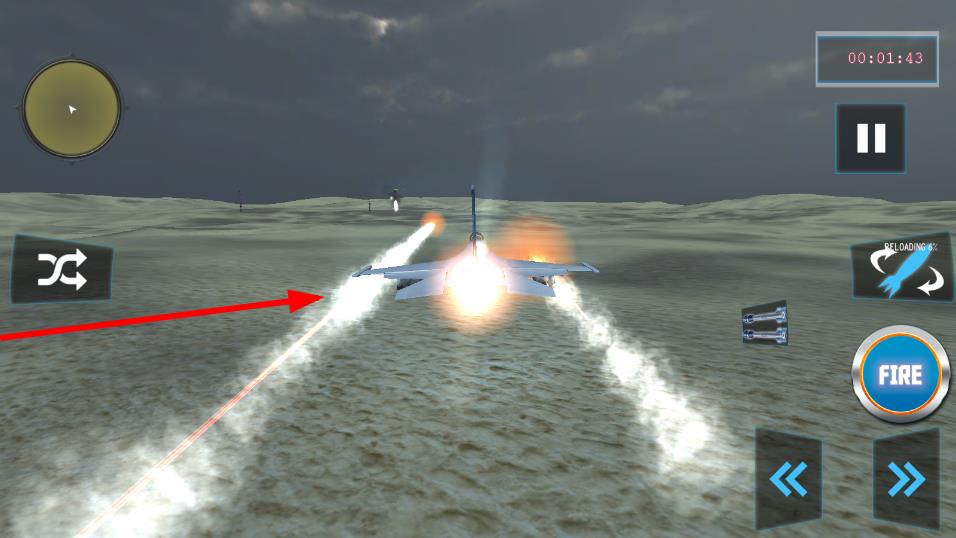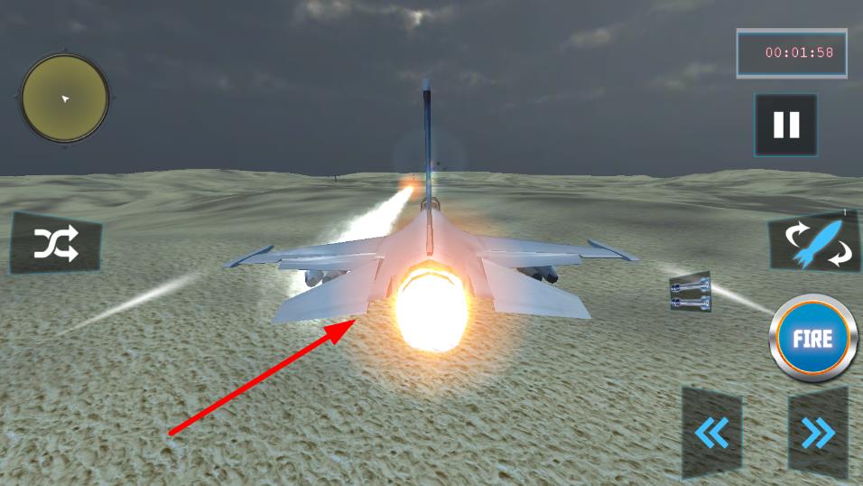 2、沙漠場景中,操控戰(zhàn)機(jī),用右側(cè)FIRE按鈕發(fā)射武器,左側(cè)按鍵調(diào)整方向,攻擊目標(biāo)。