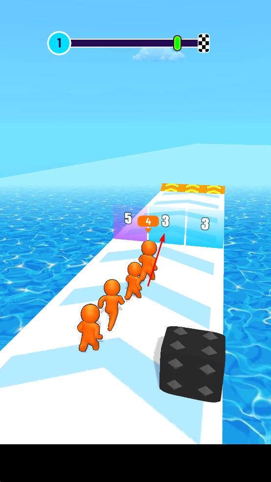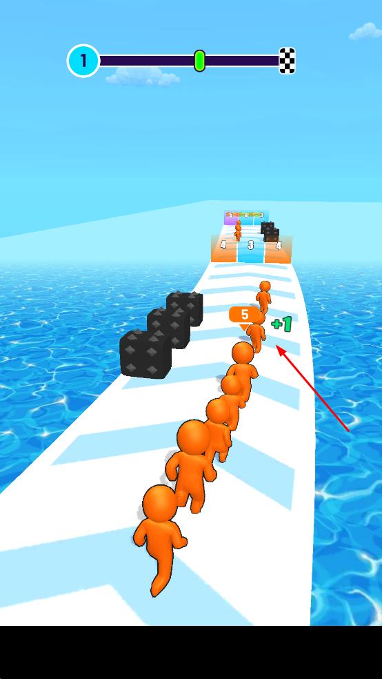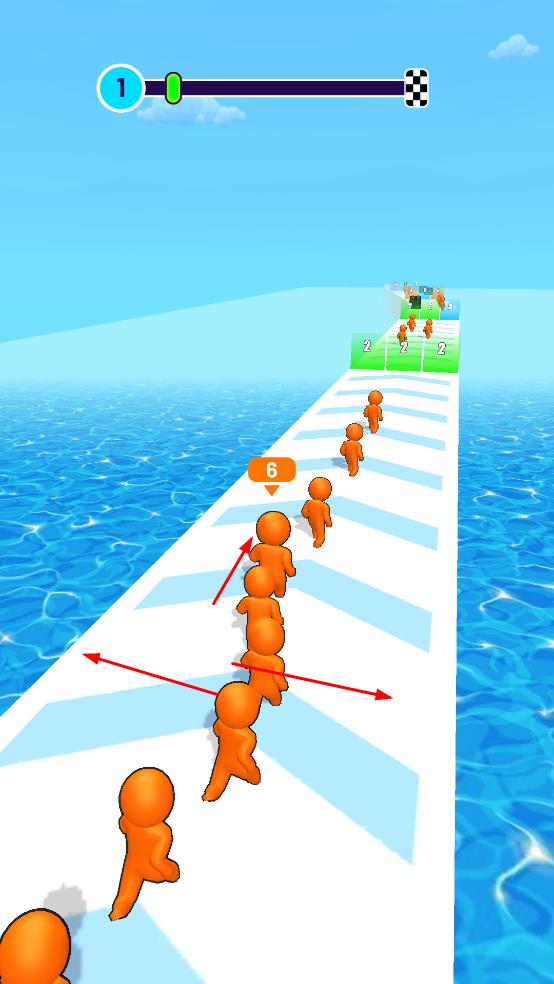 1、操控橙色小人隊(duì)伍在水上賽道上移動(dòng),通過左右移動(dòng)使隊(duì)伍聚集或分散,這是開啟游戲的關(guān)鍵操作,順利開啟游戲之旅。
