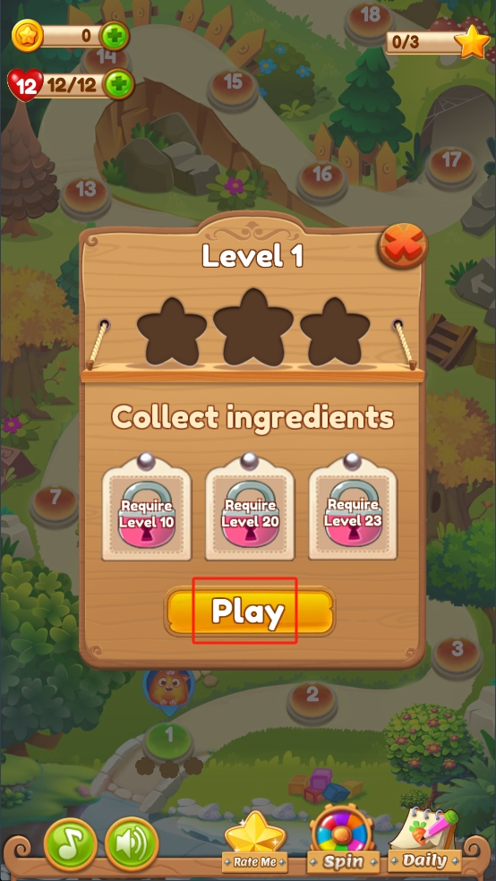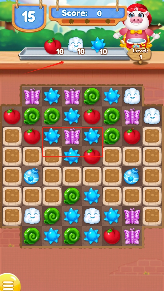 1、點(diǎn)擊關(guān)卡界面黃色Play按鈕,進(jìn)入Level1,需收集蘋果、云朵、藍(lán)星三種食材,通過消除對應(yīng)元素達(dá)成目標(biāo)。