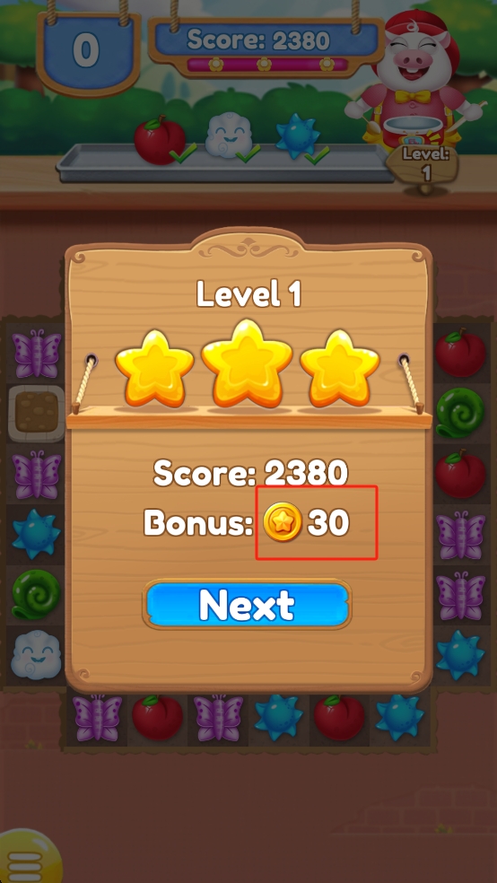 3、關(guān)卡結(jié)束后,界面展示分?jǐn)?shù)2380與獎(jiǎng)勵(lì)金幣30,點(diǎn)擊藍(lán)色Next按鈕,進(jìn)入下一關(guān)繼續(xù)食材收集挑戰(zhàn)。