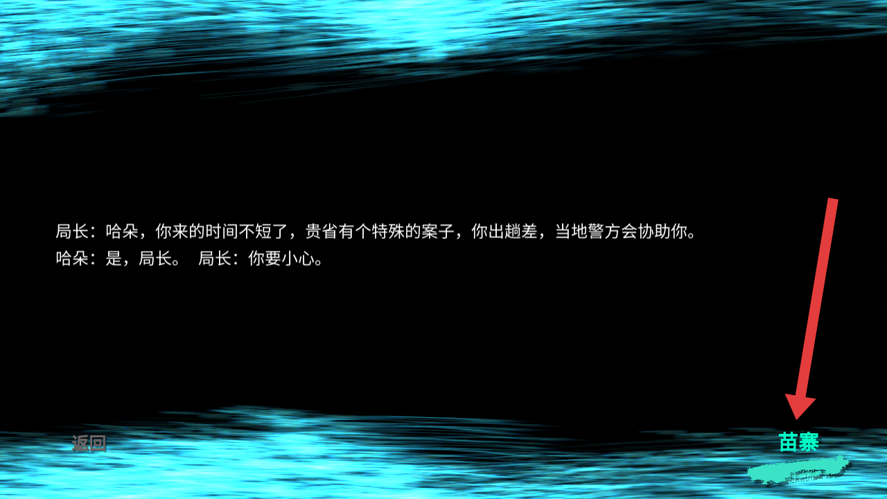1、局長委派哈朵前往苗寨辦理特殊案件,點(diǎn)擊界面右下角苗寨的選項(xiàng),接受任務(wù)并進(jìn)入案發(fā)區(qū)域。