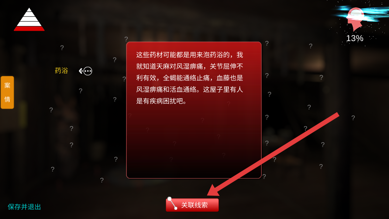 2、在分析藥浴藥材天麻、全蝎、血藤的功效信息后,點(diǎn)擊紅色關(guān)聯(lián)線索按鈕,將這些線索進(jìn)行整合。