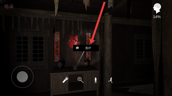 3、在苗寨室內(nèi)場景中,點(diǎn)擊供桌上的香爐進(jìn)行調(diào)查,把相關(guān)的消息集中在大腦中,注意現(xiàn)在大腦線索進(jìn)度14%。