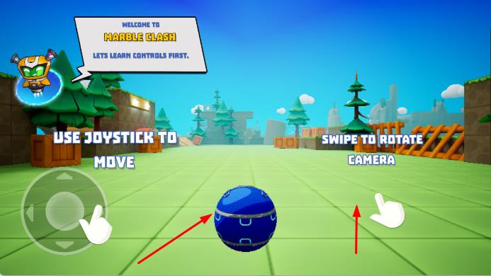 1、進入游戲,通過左側(cè)虛擬搖桿控制彈珠移動,滑動屏幕右側(cè)可旋轉(zhuǎn)視角,熟悉操作后開啟對戰(zhàn)。