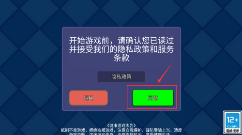 1、點(diǎn)擊紅框綠色同意按鈕,確認(rèn)隱私政策開(kāi)始游戲。