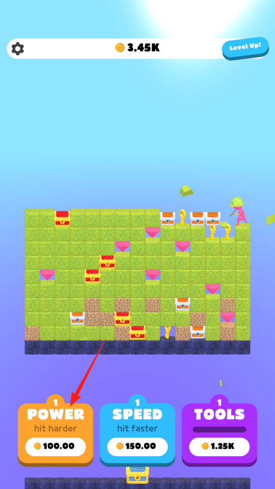 1、在打工人打工游戲界面,點擊POWER按鈕,消耗金幣提升攻擊力,通過強(qiáng)化力量屬性,讓角色挖礦更高效,打破堅硬方塊,獲取更多寶藏,體驗屬性升級機(jī)制。