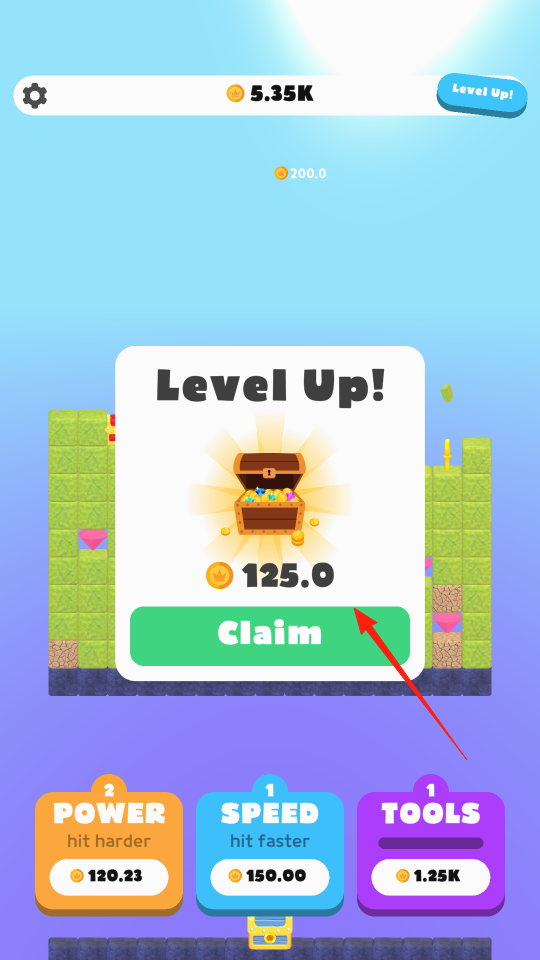 2、當(dāng)角色升級后,出現(xiàn)Level Up彈窗,點擊Claim,領(lǐng)取升級獎勵金幣,利用獎勵,繼續(xù)強(qiáng)化屬性或解鎖工具,助力挖礦進(jìn)程,體驗升級收益玩法。