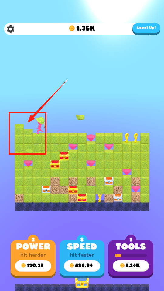 3、操控角色在綠色方塊地形移動,翻越障礙,尋找寶藏,通過規(guī)劃路線,避開難以挖掘的區(qū)域,優(yōu)先收集寶箱與鉆石,體驗挖礦探索機(jī)制。