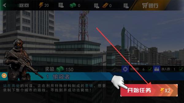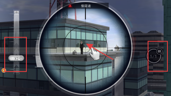 3、在狙擊游戲場景中,利用左側的倍率調(diào)整按鈕和右側的射擊按鈕,瞄準紅色箭頭所指的目標,完成狙擊任務。