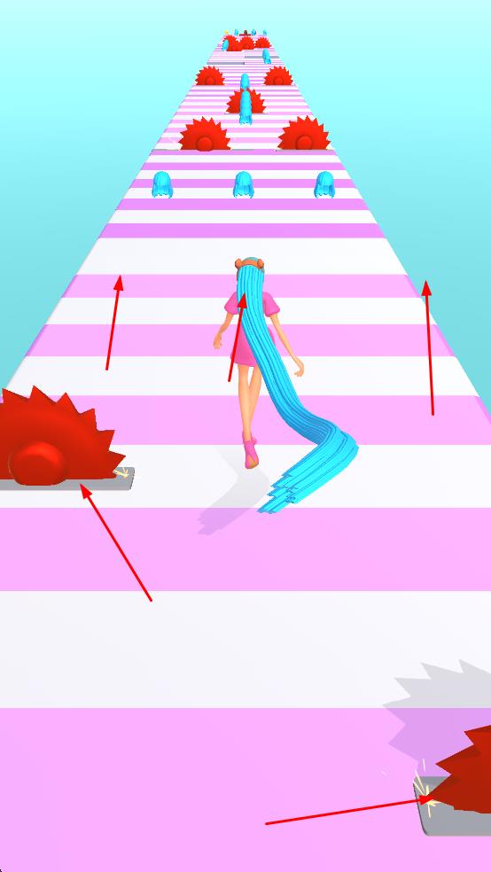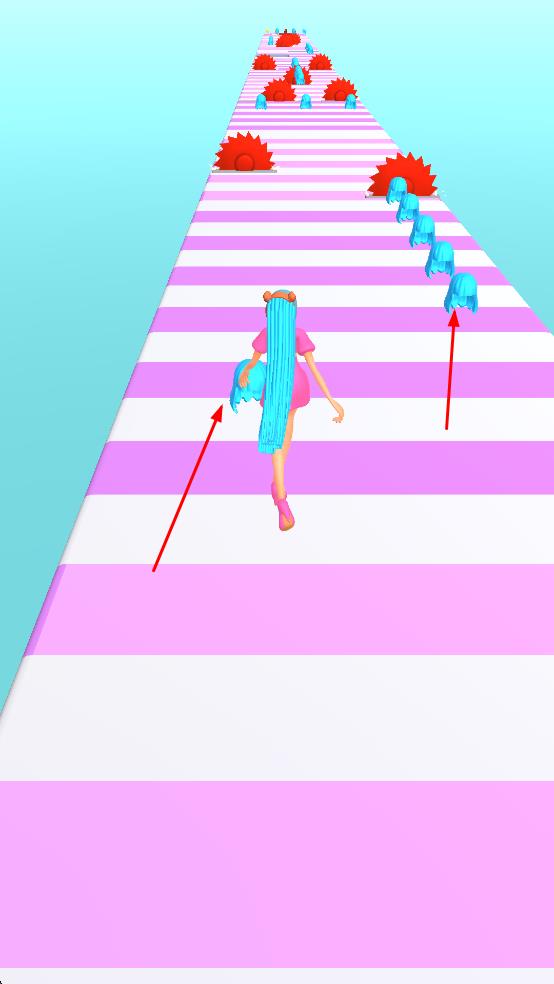 3、隨著角色收集更多的藍(lán)色頭發(fā)道具,角色的頭發(fā)會(huì)變長,繼續(xù)操控角色躲避障礙物,向關(guān)卡終點(diǎn)前進(jìn)。