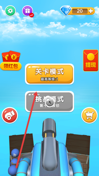 1、在游戲主界面通過點(diǎn)擊關(guān)卡模式按鈕,隨后進(jìn)入關(guān)卡選擇,開啟等級1的射擊闖關(guān)挑戰(zhàn)。