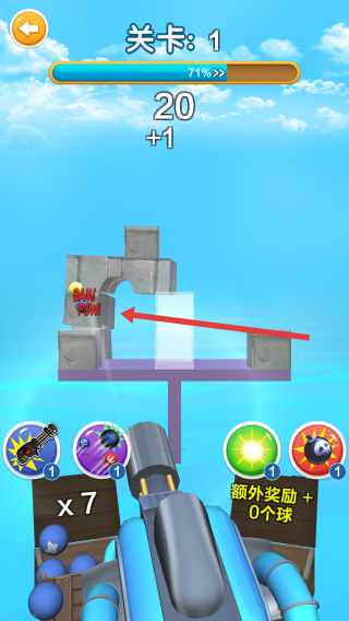 2、在關(guān)卡1中,點(diǎn)擊屏幕操控炮臺射擊,瞄準(zhǔn)石塊建筑發(fā)射炮彈,擊碎目標(biāo)推進(jìn)游戲進(jìn)程。