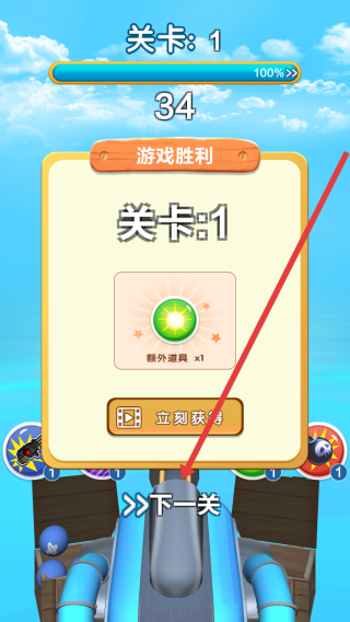 3、成功通關(guān)結(jié)束后,可以點(diǎn)擊下一關(guān)按鈕,領(lǐng)取額外道具獎勵,繼續(xù)挑戰(zhàn)更高難度關(guān)卡。