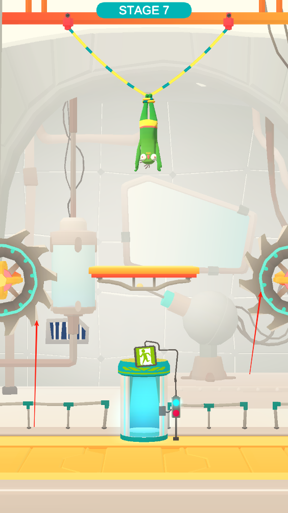 2、兩邊的齒輪會(huì)上下移動(dòng),為了避開,一刀直接切斷兩根線,讓僵尸掉落到平臺(tái)上,僵尸會(huì)自己走下去到出口。