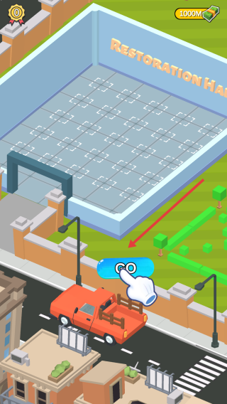 1、進(jìn)入游戲后,依據(jù)提示點(diǎn)擊藍(lán)色按鈕,將卡車所運(yùn)物品送入修復(fù)大廳,開啟收集或修復(fù)流程。