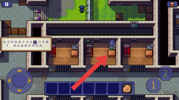 3、呈現(xiàn)監(jiān)獄場景,有走近你的桌子點擊①打開桌子,拿走里面所有東西的操作提示,玩家操控角色在監(jiān)獄房間活動,屬于收集物品的基礎(chǔ)流程環(huán)節(jié)。