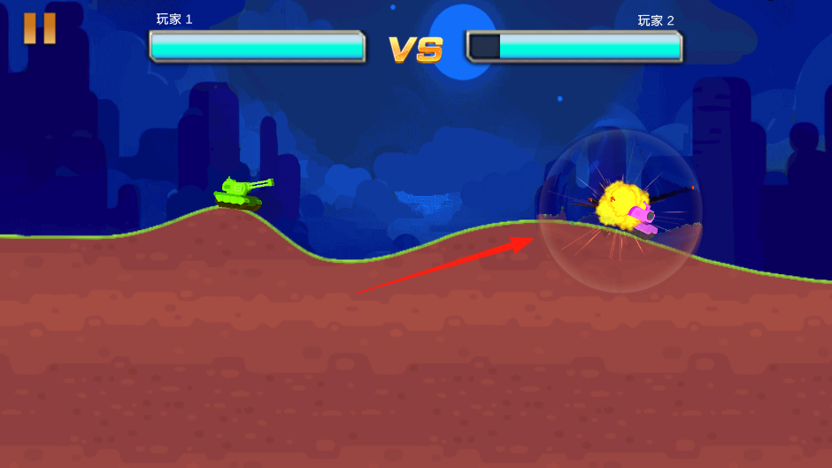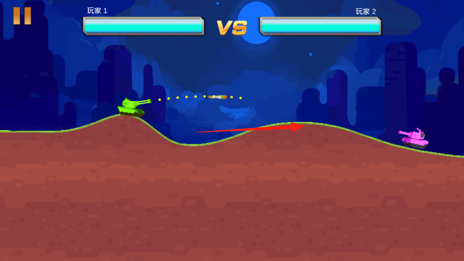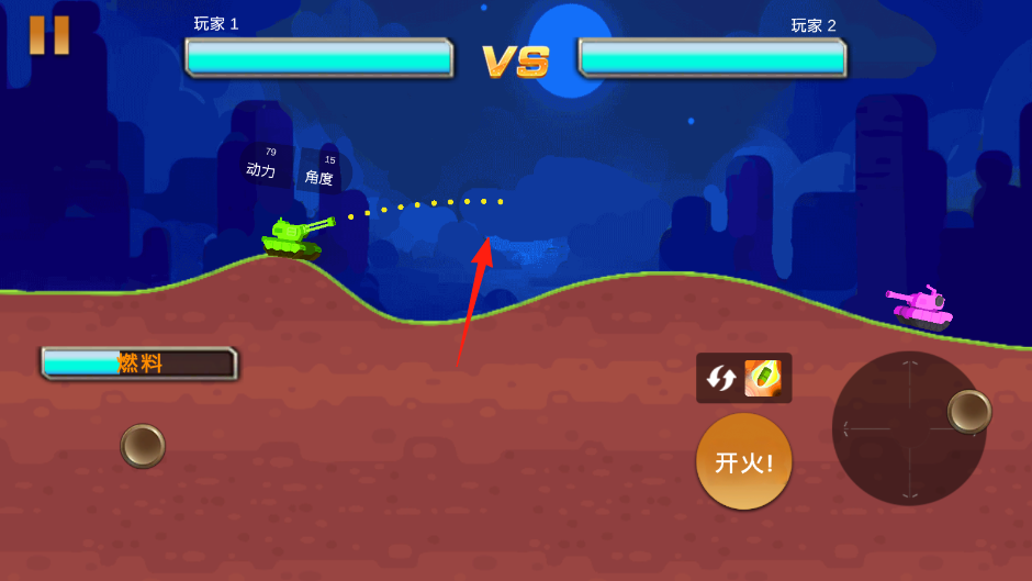 2、發(fā)射炮彈后,根據(jù)紅色箭頭指示軌跡,讓炮彈飛越地形,精準(zhǔn)打擊粉色坦克。