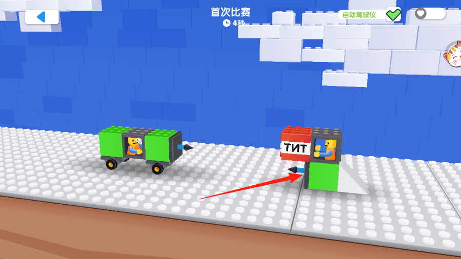1、比賽開始,操控綠色賽車,按箭頭方向指引,靠近帶TNT的目標(biāo)車,觸發(fā)互動。