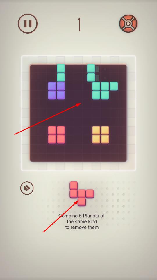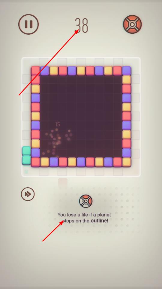 3、密切關(guān)注上方的分?jǐn)?shù)數(shù)值變化,同時謹(jǐn)記規(guī)則——若方塊停留至棋盤的輪廓邊界區(qū)域,將會扣除游戲生命,需合理規(guī)劃方塊放置位置以規(guī)避損失。