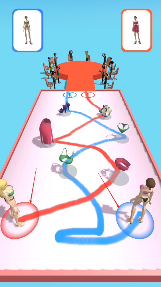 2、仔細(xì)看清兩個(gè)女孩要穿的服飾,容易混淆,按照?qǐng)D中畫線,讓兩個(gè)女孩穿上正確的服飾,走上T臺(tái)。