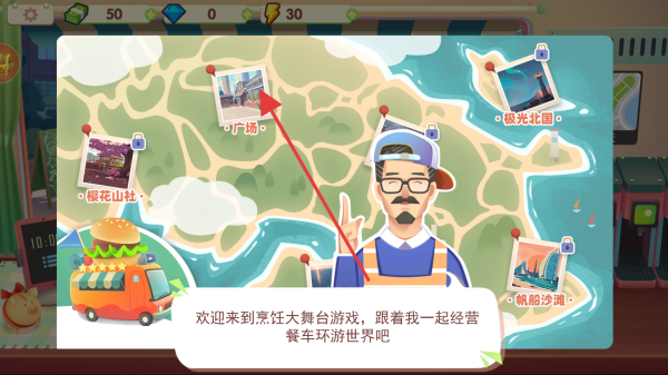 2、在游戲的主場景中,根據紅色箭頭所指的方向,選擇廣場位置,前往該地點進行餐車的經營,開始為顧客提供美食。