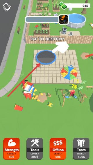 1、進入游戲場景,依據(jù)TAP TO DESTROY提示,點擊指定物品,觸發(fā)破壞流程,成功破壞后可獲取金錢。