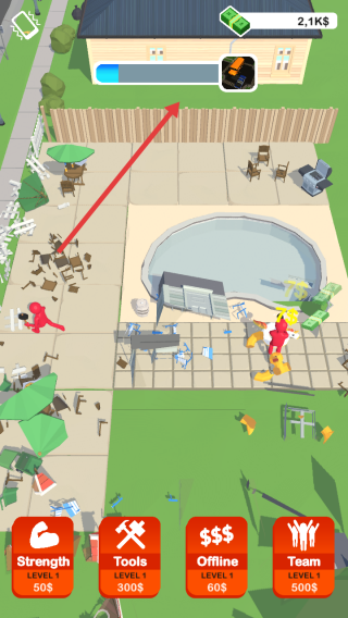 3、不斷破壞場景內物品家具、建筑等積累金錢,利用金錢升級下方功能,提升破壞效率與收益,推進關卡進程。