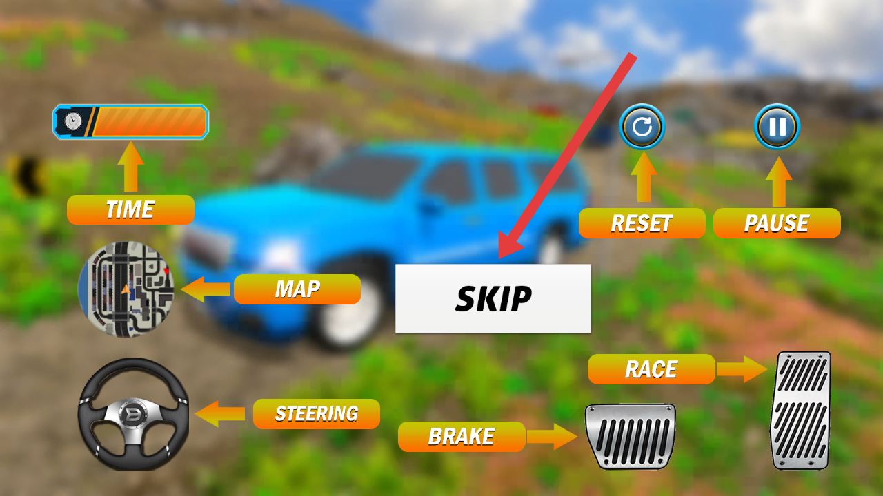 1、進(jìn)入游戲的界面,可以點(diǎn)擊SKIP跳過游戲指引,或者先熟悉操作功能區(qū),再開啟賽車挑戰(zhàn)。