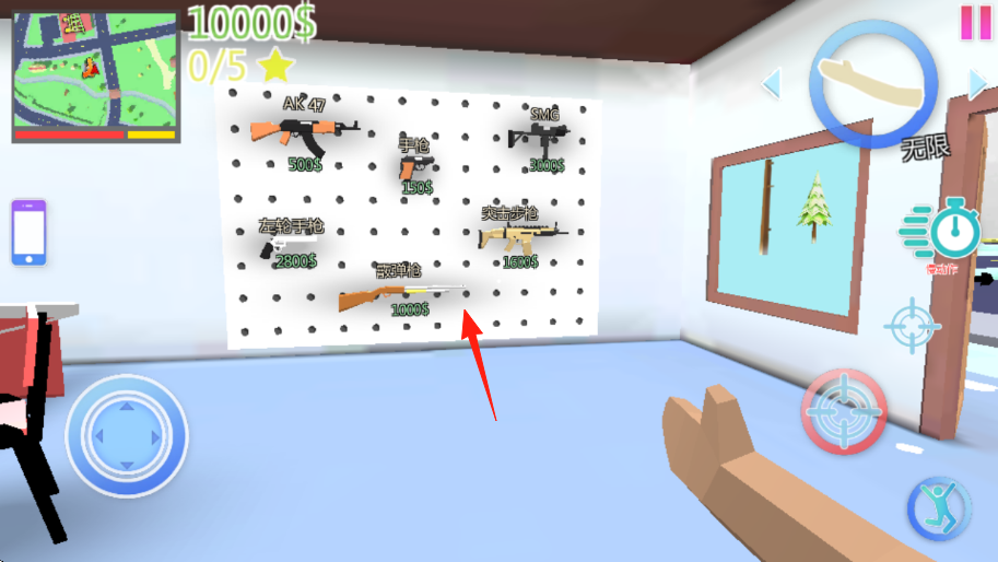 1、進入游戲后在武器的房間,按箭頭指引,選擇1000的散彈槍,花費金幣購買。
