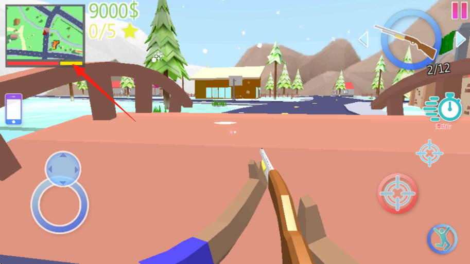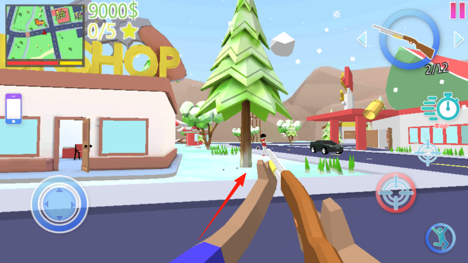 2、持槍出房間,進入城市街道,沿箭頭方向,瞄準目標人物車輛,點擊射擊,完成任務(wù)目標。