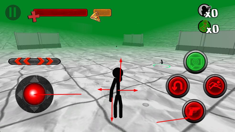1、操控黑色火柴人角色在灰色石質(zhì)地場(chǎng)景中移動(dòng),角色可前后左右移動(dòng)。