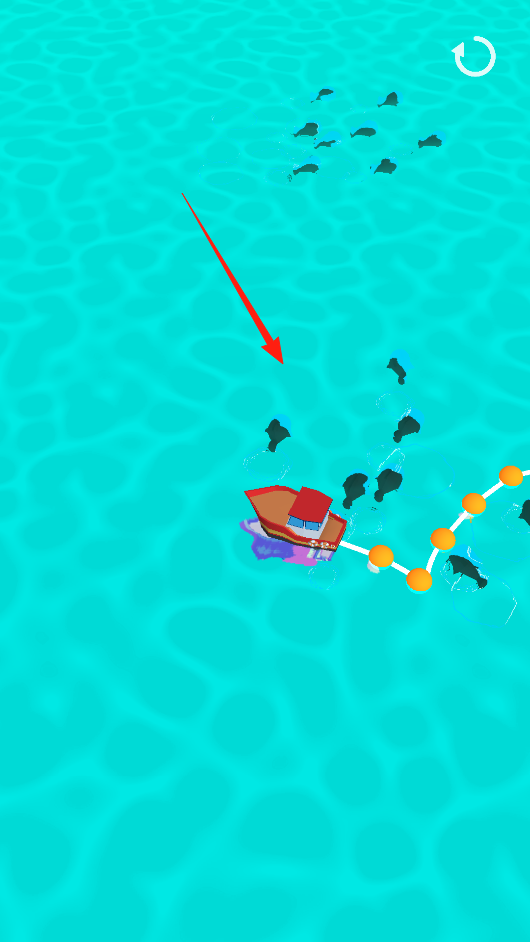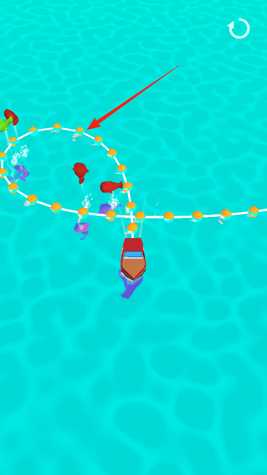 3、繼續(xù)操控小船,沿路線圓點行駛形成環(huán)形軌跡,利用環(huán)形路線,包圍彩色魚群擴大捕撈成果,積累更多魚類,體驗路線策略捕撈機制。
