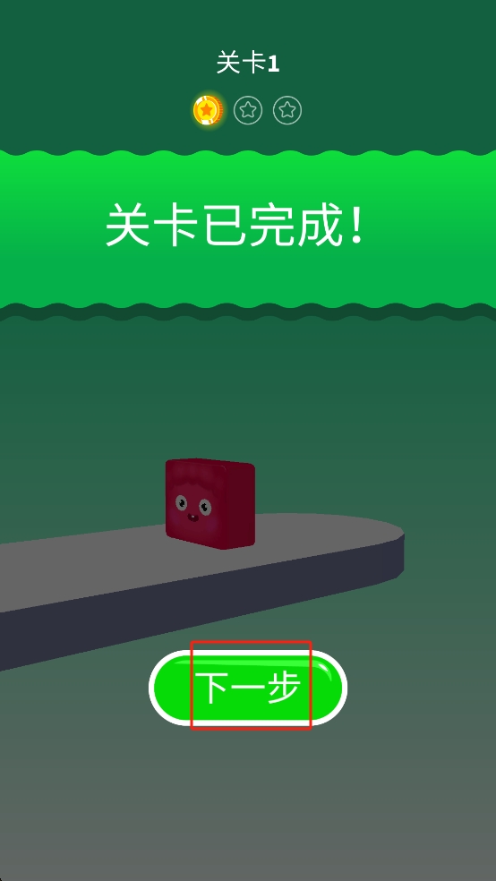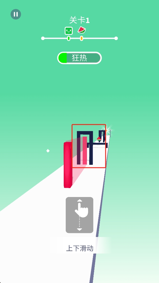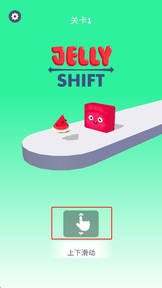 1、進(jìn)入關(guān)卡1,按上下滑動(dòng)提示,滑動(dòng)屏幕控制紅色果凍方塊變形,調(diào)整形態(tài)避開障礙,朝著西瓜方向移動(dòng)。