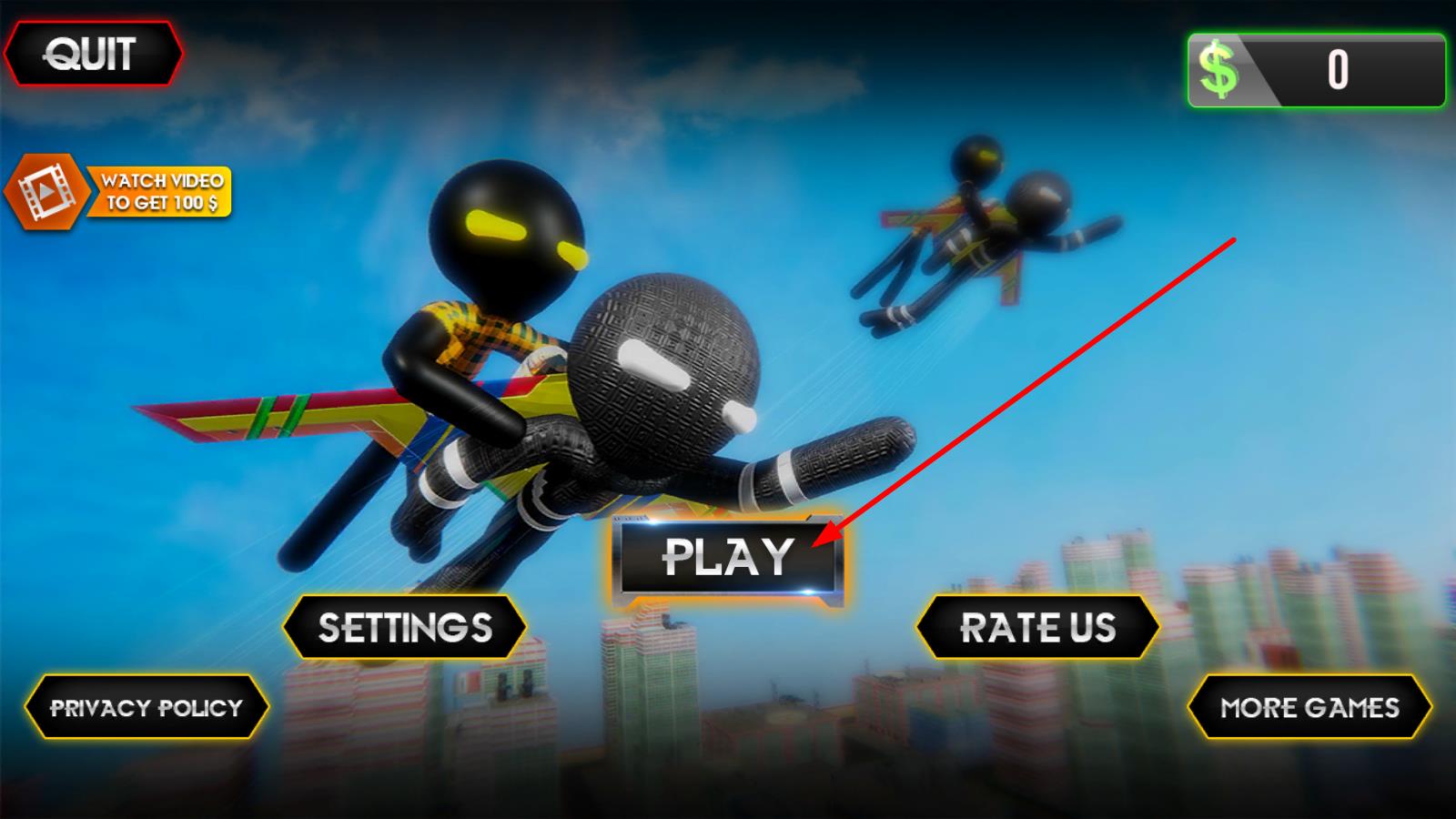 1、進(jìn)入游戲主界面,點(diǎn)擊PLAY的按鈕,開啟火柴人飛行挑戰(zhàn),準(zhǔn)備在城市上空展開冒險(xiǎn)。