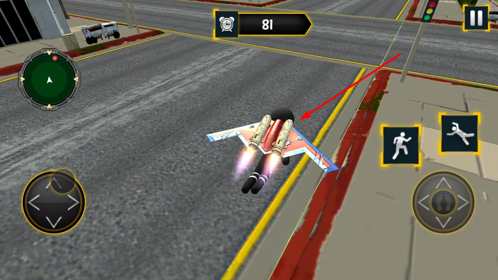 3、操控裝備飛行器的火柴人,利用虛擬按鍵,在城市道路上空飛行,注意躲避障礙,完成飛行任務(wù)。