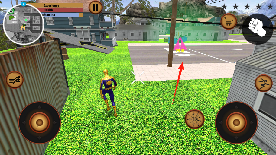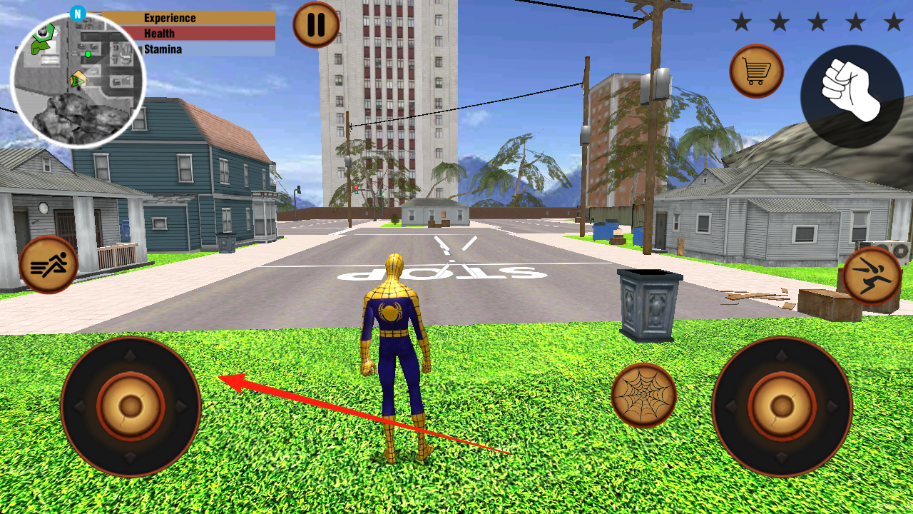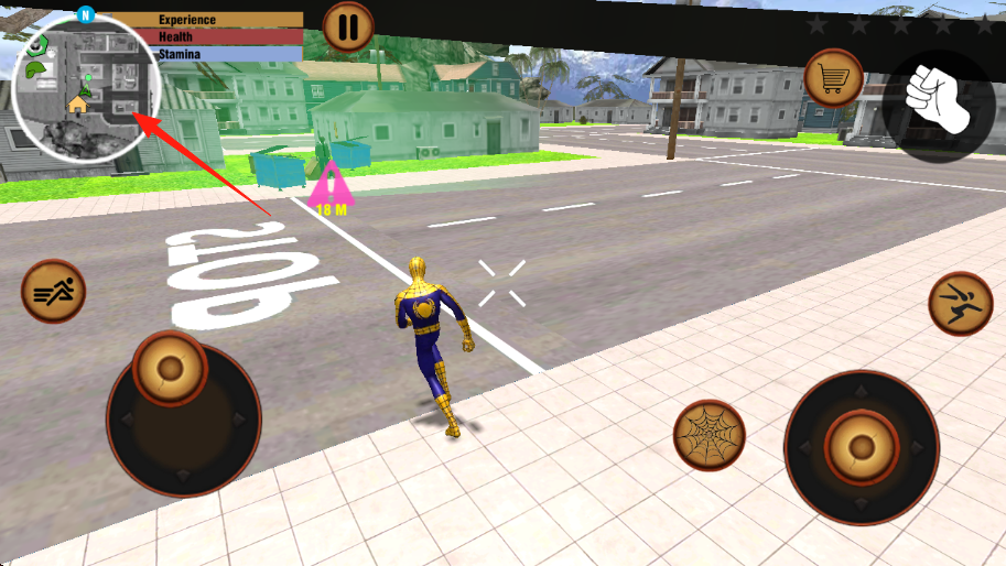 1、操控蜘蛛俠,按箭頭指引,通過左側(cè)搖桿移動(dòng),探索城市街道,注意界面Experience經(jīng)驗(yàn),Health血量狀態(tài)。