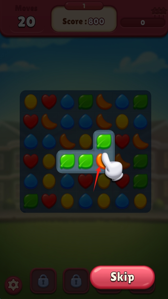 1、移動方塊,湊齊同色或同形狀,觸發(fā)消除,獲取分?jǐn)?shù),完成關(guān)卡目標(biāo),滑動消除相同方塊。