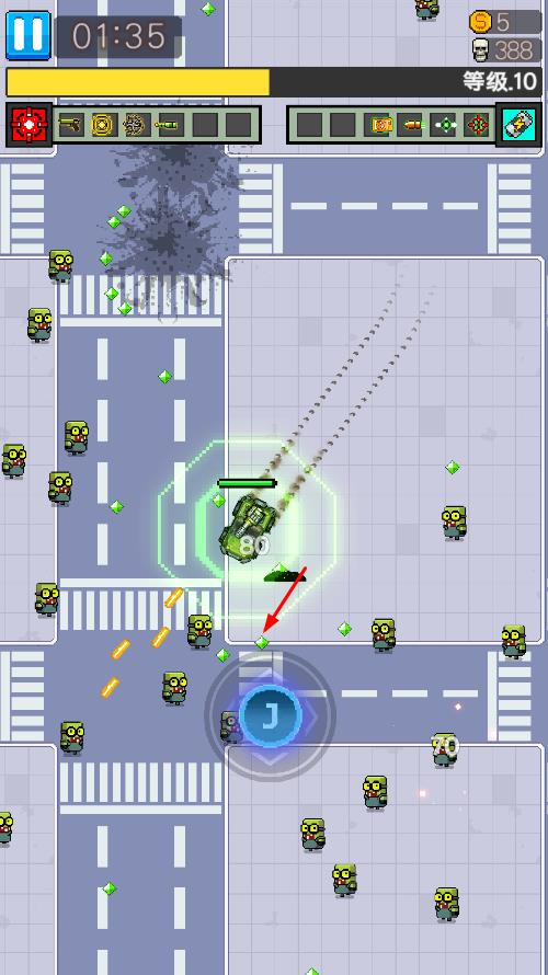 2、坦克會自動對僵尸進行射擊,在戰(zhàn)斗過程中,收集金幣和道具,來提升實力。