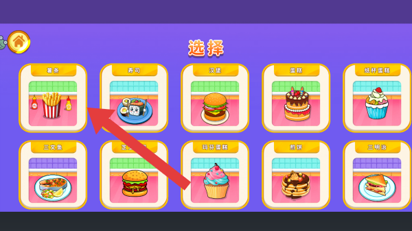 1、顯示有多種食物選項,包括薯條、壽司、漢堡、蛋糕、紙杯蛋糕等,根據(jù)提示進行選擇。