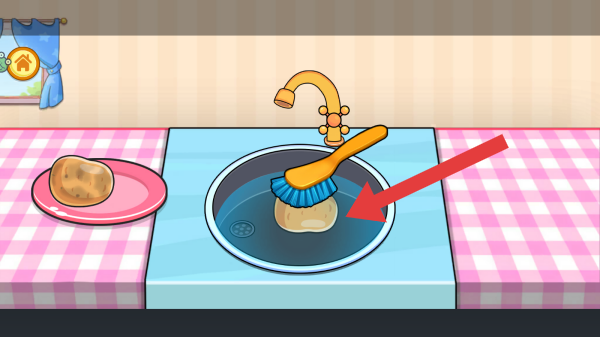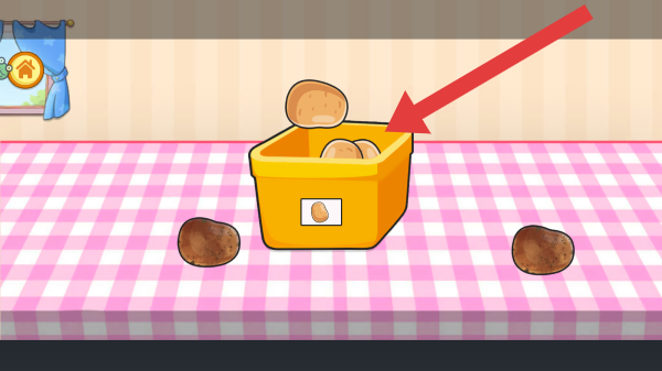 2、畫面呈現(xiàn)廚房場景,有裝著土豆的黃色容器,桌上散落土豆,屬于模擬處理食材環(huán)節(jié)的內(nèi)容,主要圍繞食材準備等基礎(chǔ)玩法展示。