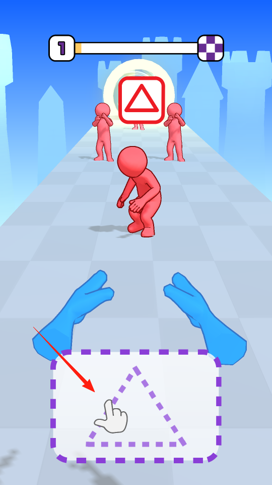 2、游戲中出現(xiàn)警示標(biāo)志,需在下方區(qū)域繪制對(duì)應(yīng)圖形,畫出三角形使角色做出規(guī)避動(dòng)作,安全通過障礙,體驗(yàn)圖形匹配避險(xiǎn)玩法。